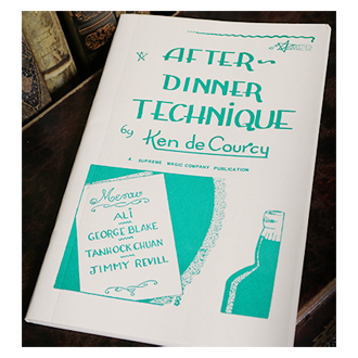 Fascicoletto di 64 pagine, illustrato graficamente. L’intrattenimento magico alle cene di societa’, di associazioni o eventi simili, e’ al centro di questo interessantissimo e, allo stesso tempo, divertente testo in cui Ken de Courcy espone la sua “tecnica” del titolo nella prima parte e una serie di effetti (anche di altri autori) nella seconda. La parte dedicata alla tecnica si offre di dare una serie di consigli sia pratici, sia teorici, su questo genere di esibizioni (e di lavoro), dalla scelta dell’abito a quella del repertorio, dalle condizioni di lavoro alla scelta dello spettatore, se utilizzare e come la musica o approfittare di qualche contrattempo per creare divertimento. Per quello che riguarda invece la parte dedicata agli effetti, e’ un bellissimo esempio di come dei classici della prestigiazione come il gioco delle sei carte (“six card repeat”), le banconote bruciate o la sparizione della sigaretta nel fazzoletto, possono essere trasformati, con dei piccoli accorgimenti e tanta esperienza, in dei piccoli gioielli di divertimento per il pubblico. Anche se forse un po’ datato in alcuni aspetti, un’ottima e divertente lettura.