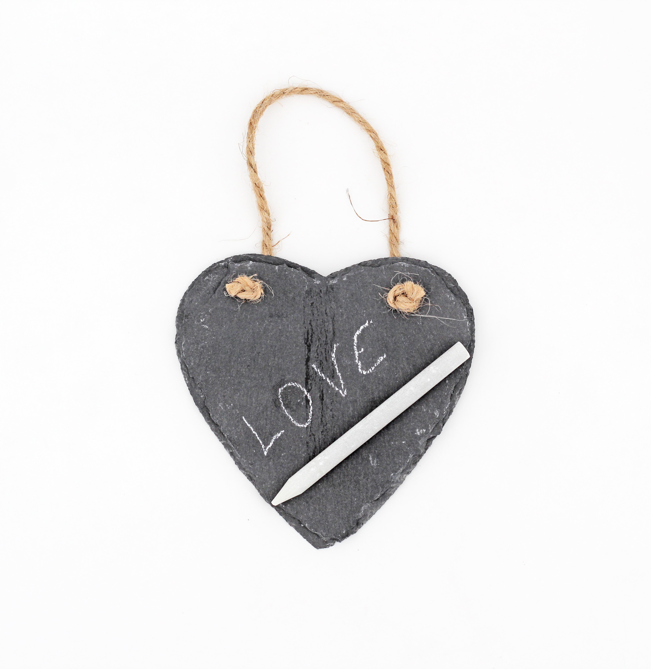 Applicazione cuore in ardesia con gesso, dimensione: altezza 10 cm.