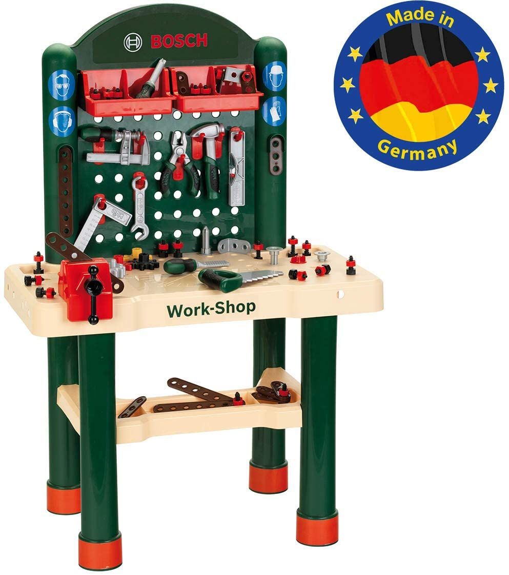 Il banco da lavoro nel design Bosch ha un piano di lavoro effetto legno con funzione di apprendimento e un gioco di chiodi integrato. Gli accessori compresi sono: un cacciavite, una chiave inglese, una pinza, una lima, un martello, una sega, livella, una squadra, una morsa, una morsa da banco, due scatole di stoccaggio, chiodi, viti, dadi così come anche stecche corte e lunghe.