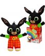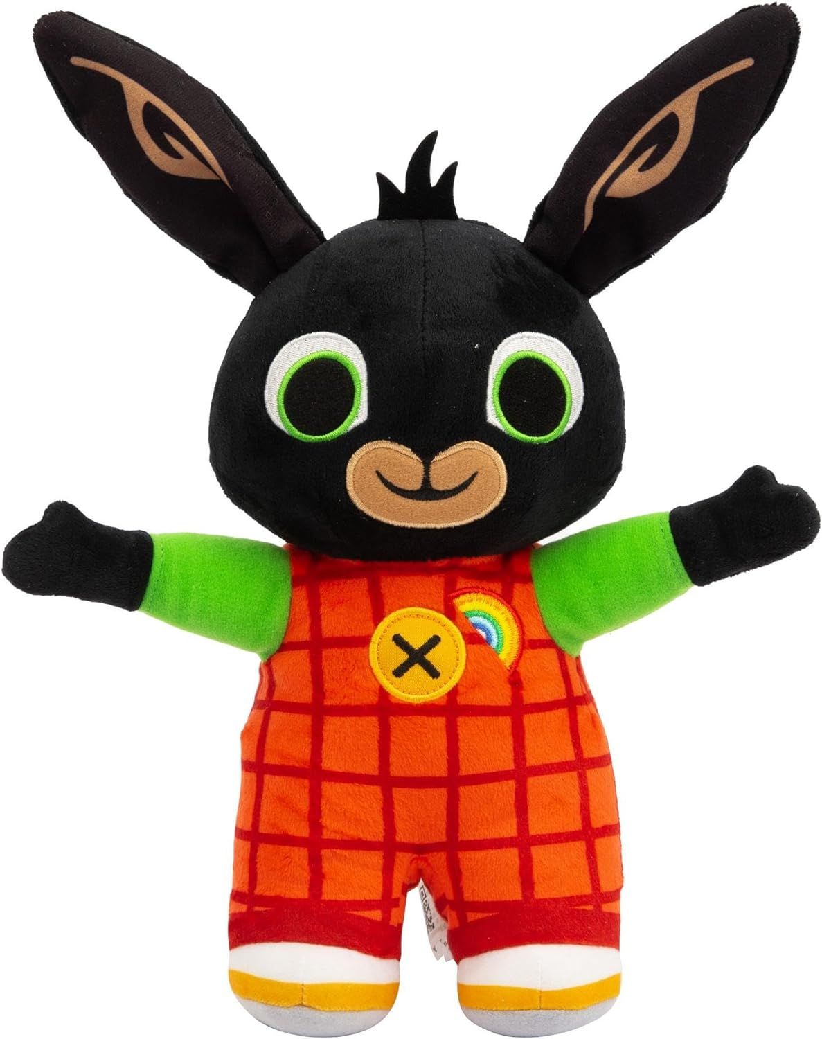 CON DETTAGLI UNICI:Â l’arcobaleno ricamato sulla salopette, il bottone con funzione di illuminazione sul retro e la posa di Bing con le braccia in aria rendono questo peluche unico!