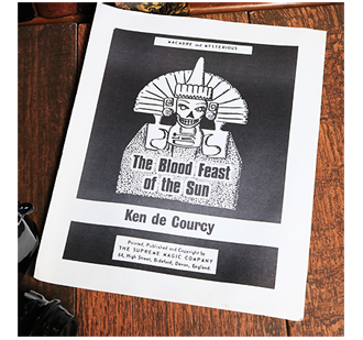 Opuscolo di 8 pagine, spillato, illustrato graficamente. E’ qui descritta una routine di magia bizzarra in cui il “magus”, descrivendo degli antichi rituali aztechi, mostra un foglietto di carta rotondo e lo da’ ad uno spettatore affinche’ lo appallottoli. Dopo aver ripreso la pallina in punta di dita e concentratosi per qualche istante, la poggia su un portacenere continuando a fissarla intensamente. Dopo qualche istante la pallina prende fuoco. Un vecchio segreto, ripreso e studiato da Ken de Courcy con l’aiuto di Billy McComb, accompagnato da una presentazione molto accattivante. Ottimo.