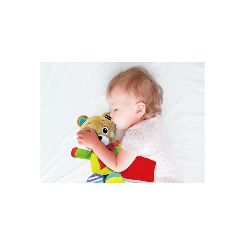 Dolce orsetto peluche un amico morbido e sicuro tutto da coccolare La copertina è ideale per trattenere l’ odore del genitore rassicurando il bambino Diversi tessuti di ottima qualità e orecchie fruscianti per supportare lo sviluppo multisensoriale Coloratissimo e lavabile in lavatrice