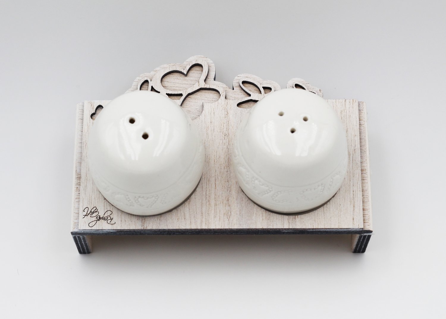 Bomboniera set sale e pepe in ceramica con base legno dimensione: lunghezza 15 cm.