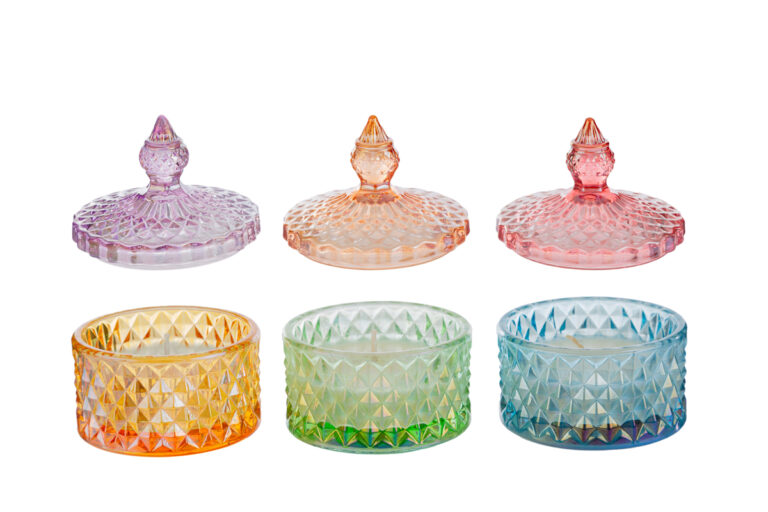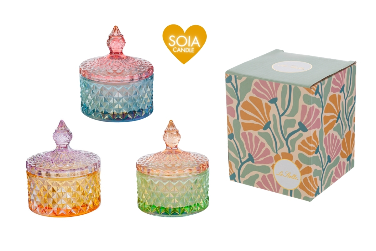 CANDELA SOIA SCATOLA VETRO COLORATO 3 ASS.8xh.10CM PZ. 3