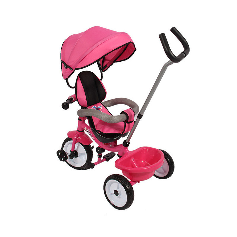 La cappottina in tessuto protegge dal sole per giocare all’aria aperta durante la bella stagione. Sulla parte alta della cappottina è fissato un secondo manubrio per consentire ai genitori di manovrare il triciclo.