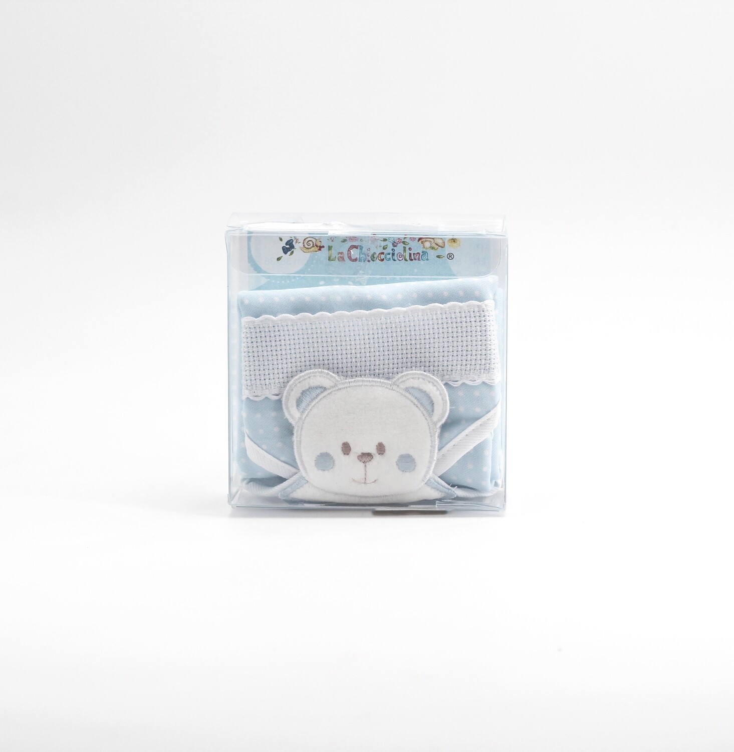 La confezione comprende 1 copertina celeste a pois con tela aida, dimensioni: 38 x 36 cm. completa di scatola