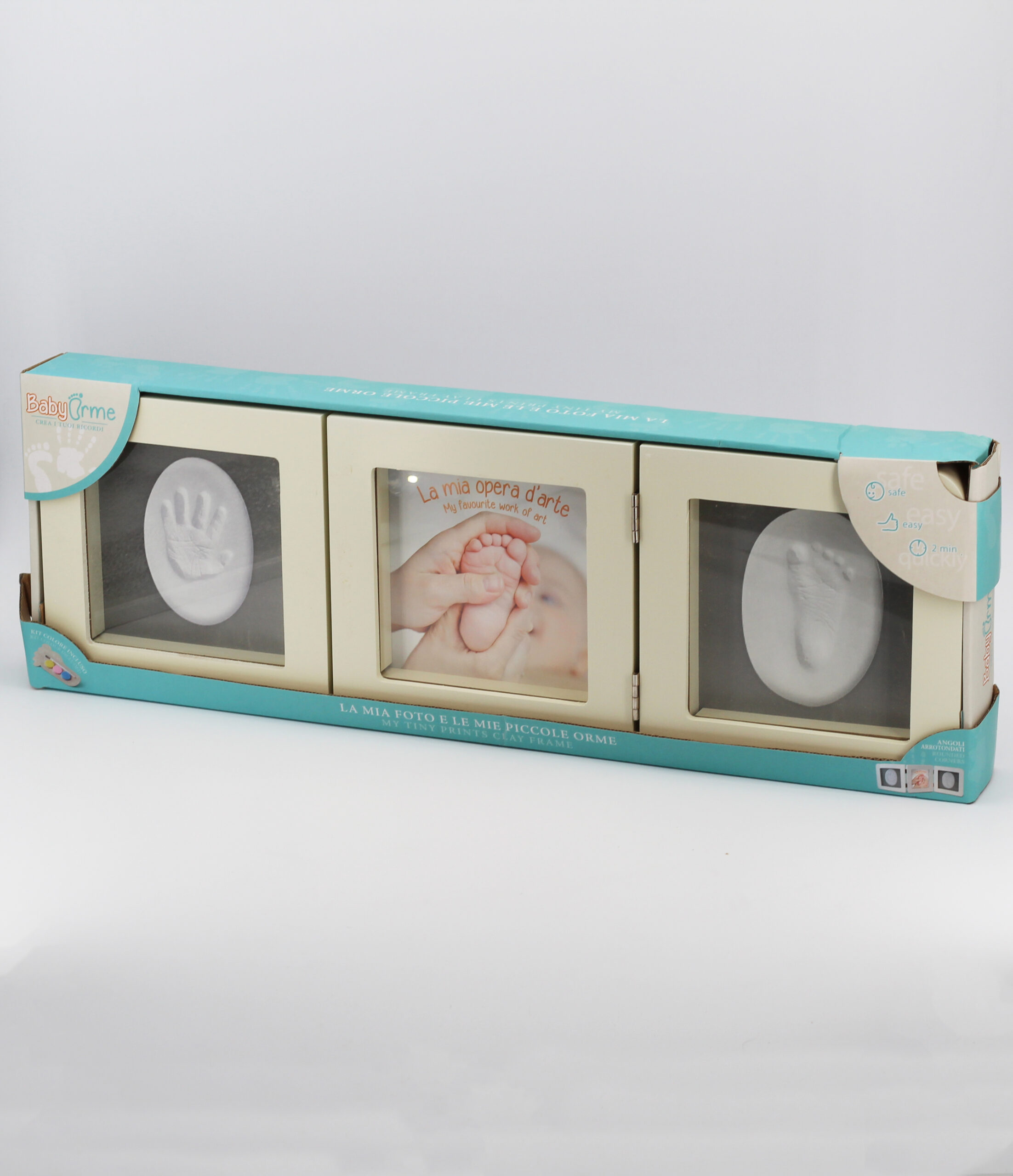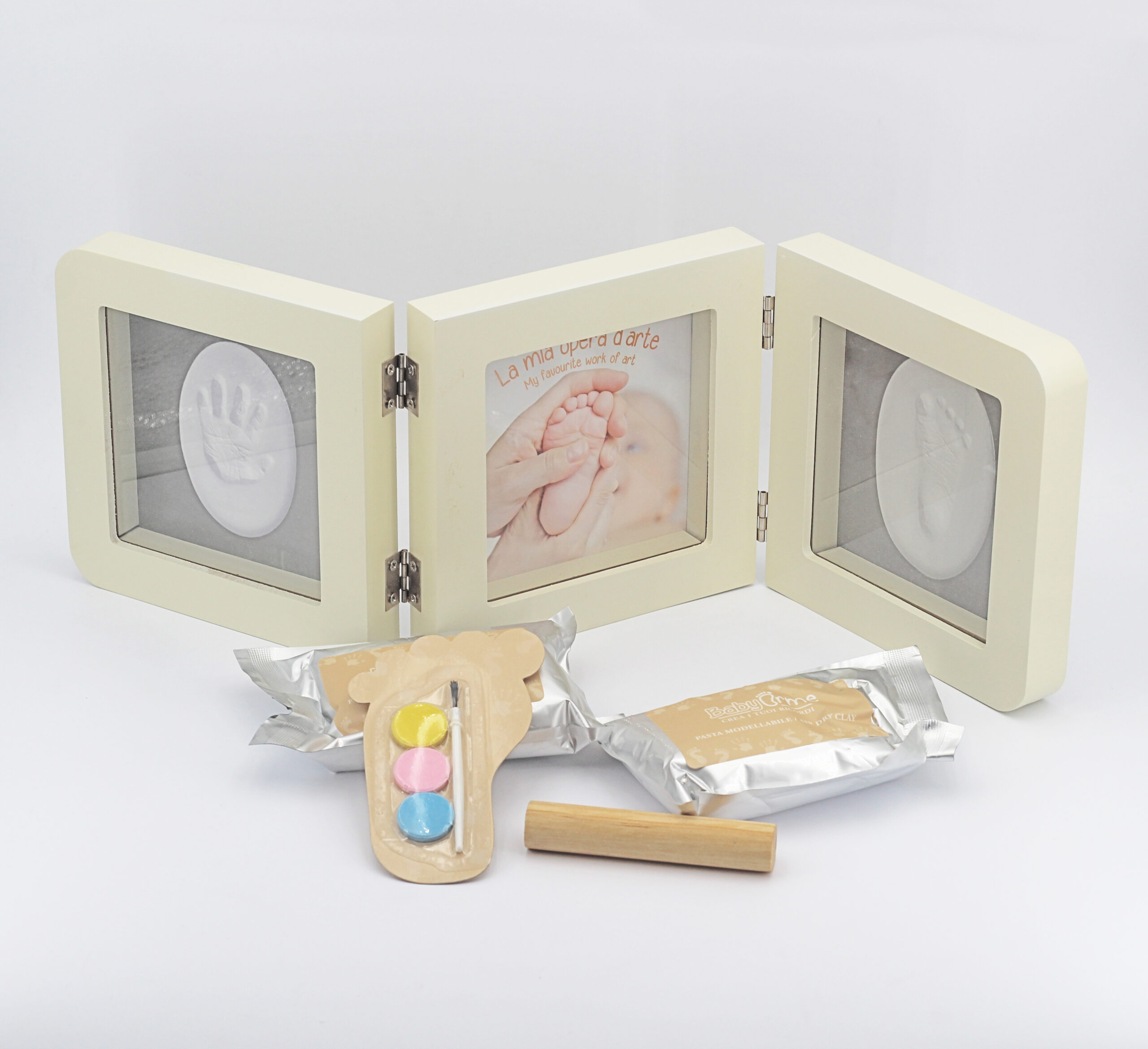 | La confezione comprende: | 1 cornice con portafoto e spazio per 2 impronte,1 busta con pasta modellabile,1 mattarello, 4 bi-adesivi 3M, 1 kit di colore |