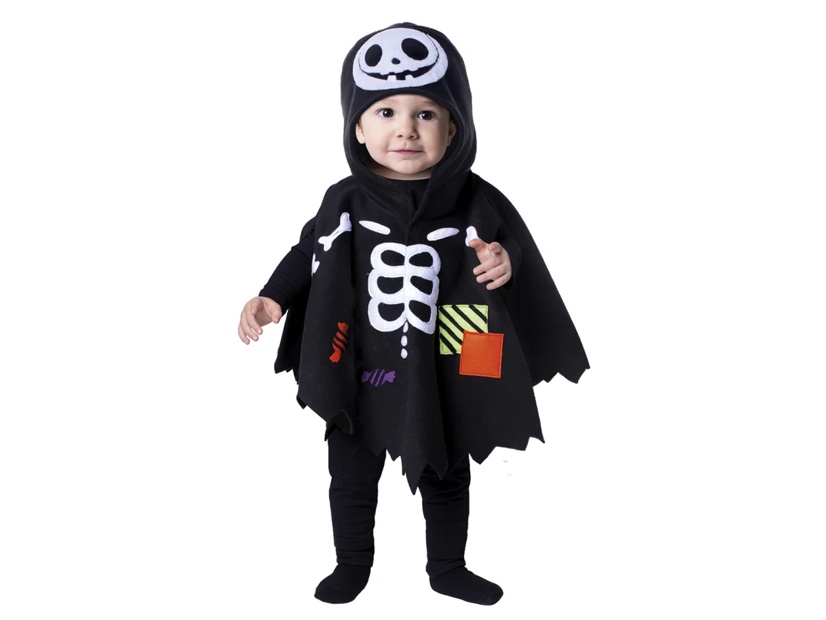 La “Mantellina ” SCHELETRINO Baby” per bambini di età  compresa tra i 128 e i 36 e i mesi . E’ un costume delizioso e spiritoso, perfetto per le festività come Halloween. Il design della mantellina rappresenta un simpatico SCHELETRINO, con dettagli adorabili come occhi grandi e sorridenti sul cappuccio e vivaci disegni  sul davanti, accompagnato da decorazioni colorate che aggiungono un tocco di vivacità  al costume. Realizzato in tessuto morbido e leggero, il costume è facile da indossare sopra ai normali vestiti, mantenendo il bambino comodo e al caldo. La mantellina è dotata di un cappuccio che completa il look da fantasmino, rendendo il costume ancora più adorabile e fotogenico. Perfetto per creare ricordi indimenticabili durante le feste!