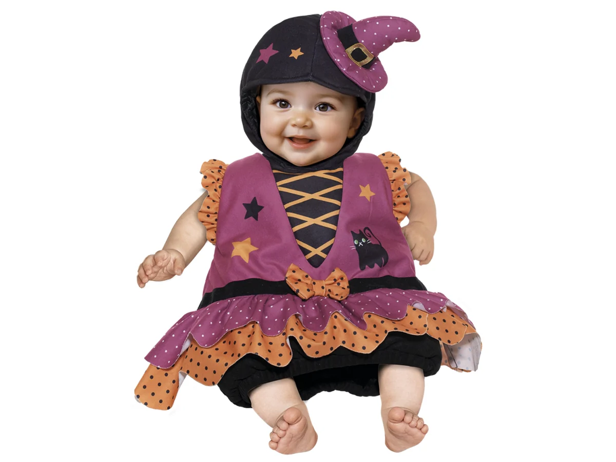 Sorprendi tutti con la Streghina più adorabile per Halloween! Tenero travestimento da streghetta per bimbe da 6 a 12 mesi di età , in morbido tessuto vellutato imbottito e foderato, con simpatiche stampe e ricami. Pratico da indossare sopra ai normali vestiti, con apertura inferiore e zip nel dietro.