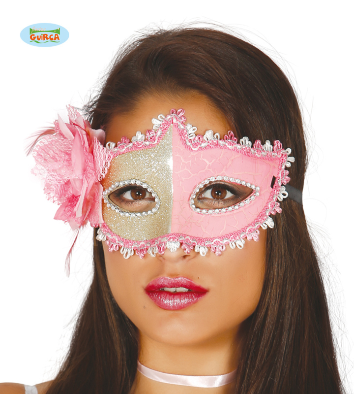 Domino Mascherina ROSA CON GLITTER ORO Fiore e Piumetta – GUIRCA 12724-8434077127247