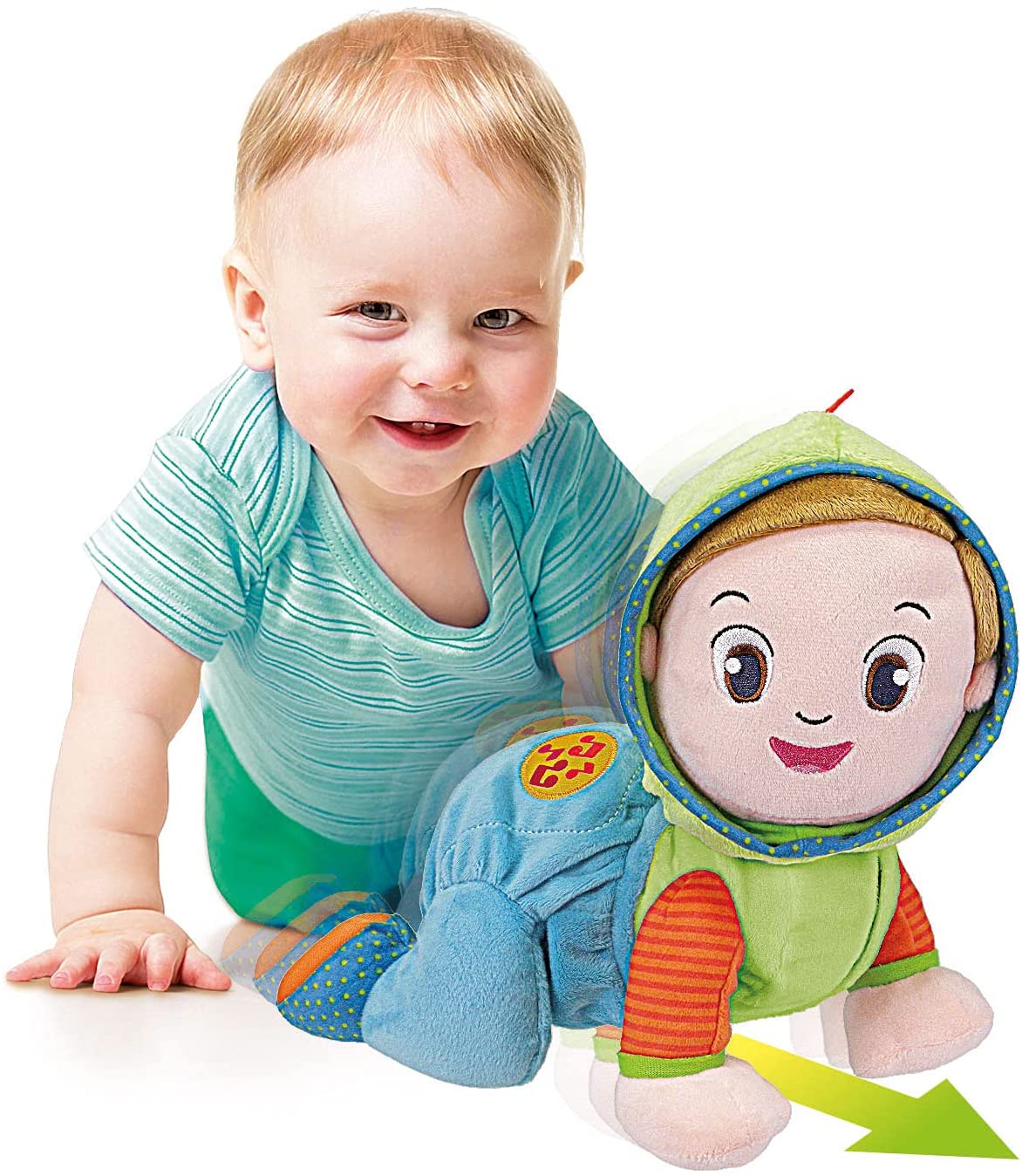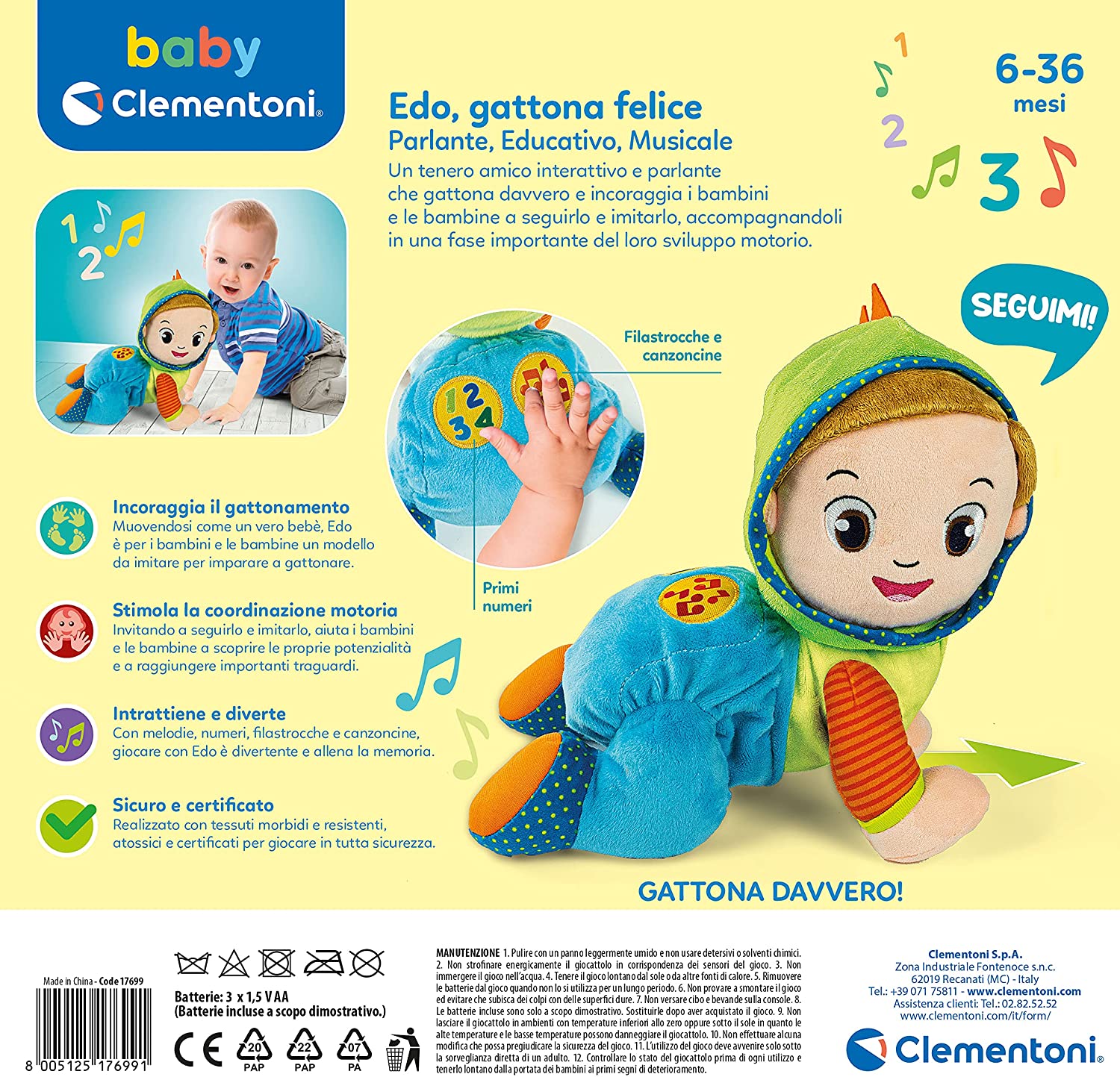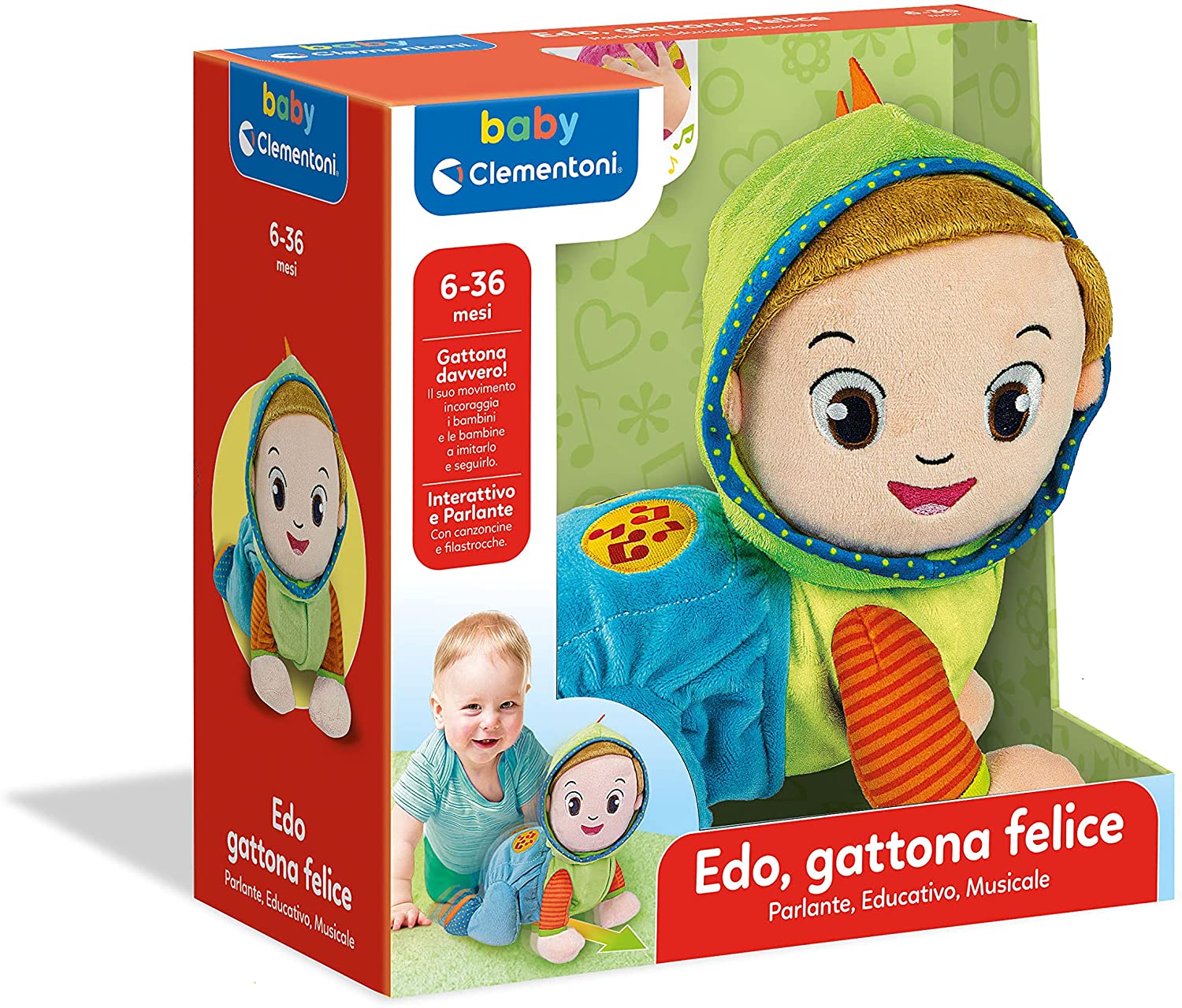 - Pronti…partenza…si gattona! Edo Gattona e Canta di Baby Clementoni è un dolce bimbo di peluche per imparare ai piccoli come muovere i primi passi nel mondo. Questo tenero peluche gattonante è anche un ricco centro attività : melodie, numeri e versi degli animali sono attivabili grazie ai due tastoni interattivi posti sulla schiena, per rendere il gioco ancora più divertente e coinvolgente. Gattona davvero e aiuta il bambino a sviluppare le capacità motorie attraverso il gioco imitativo e l’empatia, invitandolo, con la voce e con il canto, a seguire pian piano i suoi movimenti. Tante canzoncine e filastrocche per stimolare la motricità del bambino. Realizzato in materiale morbido di ottima qualità , è studiato per accompagnare il bambino in una fase della crescita importante come quella del gattonamento. Un gioco primi passi consigliato a partire dai 6 mesi, quando, spinti dalla naturale curiosità e dal desiderio di esplorare, i piccoli iniziano ad avventurarsi nel mondo andando a gattoni.