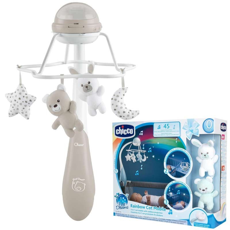 Giostrina evolutiva 3 in 1 con telecomando: riproduce melodie classiche, new age e suoni della natura. L’innovativa proiezione arcobaleno accompagna il bambino durante la nanna.