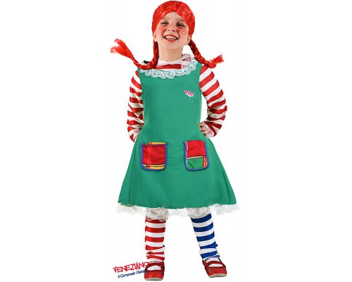 SIMPATICO COSTUME BIMBA” PIPPI BABY ” COMPOSTO DA VESTITO IN GABARDINE VERDE CON MERLETTO BIANCO MAGLIETTA IN RASO BIANCO A STRISCE ROSSE RIFINITA CON MERLETTO CALZE COLORATE PARRUCCA ( SCARPE NON INCLUSE ) I NOSTRI COSTUMI SI CARATTERIZZANO PER LA RICERCA DEI MATERIALI E DEI DETTAGLI
