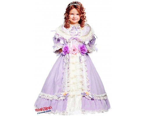 STUPENDO COSTUME BIMBA ” PRINCIPESSA SOFIA BABY ” COMPOSTO DA ABITO LUNGO IN VELLUTO DI COTONE GLICINE E TAFFETA’ ADORNATO DA MERLETTI BIANCHI CON FIOCCHI IN RASO GLICINE FIORI SOVRAPPOSTI STOLA CORONCINA IN NICKEL CON BRILLANTINI