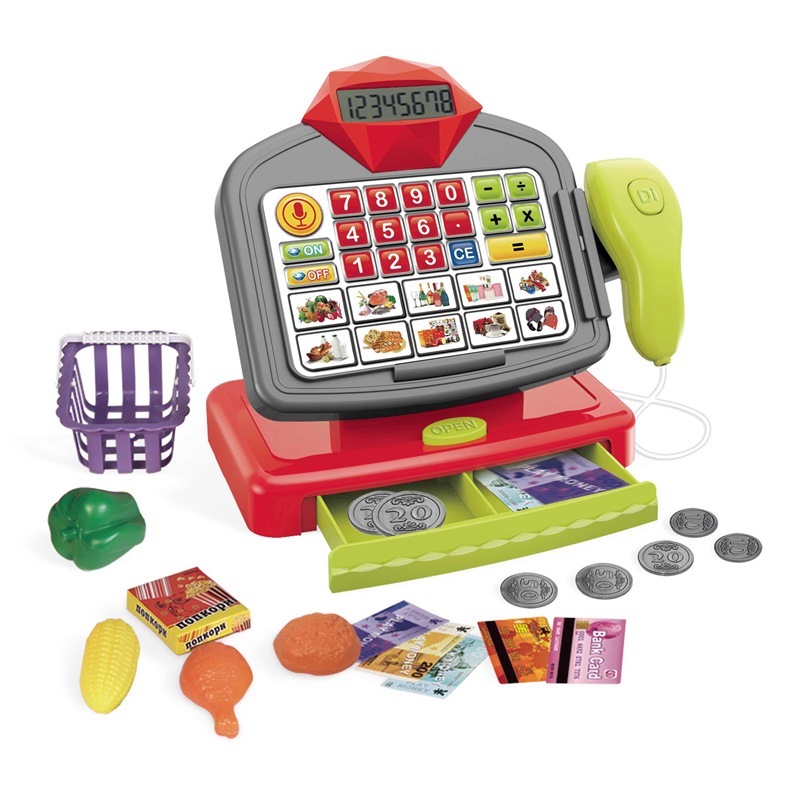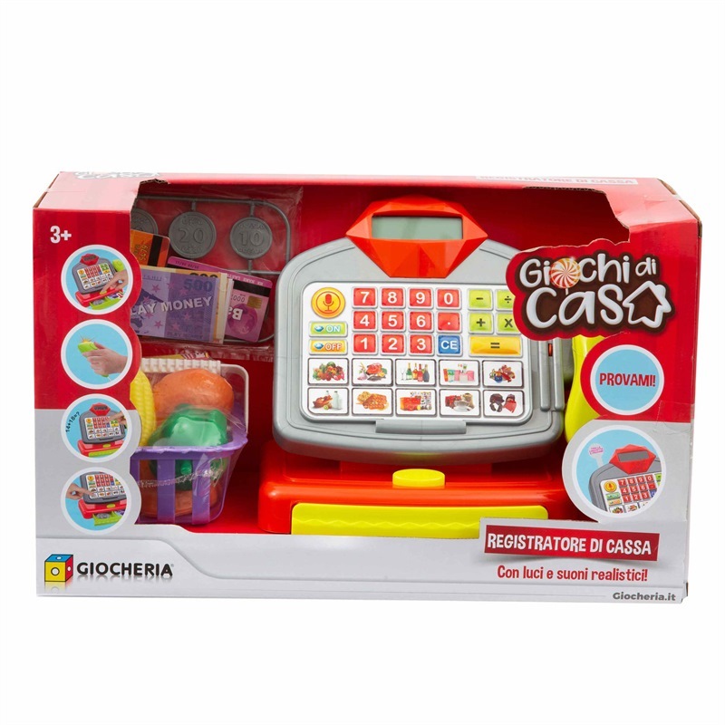 Registratore di cassa con cassetto apribile. Include il cestino della spesa con tanti alimenti, monete e banconote gioco.