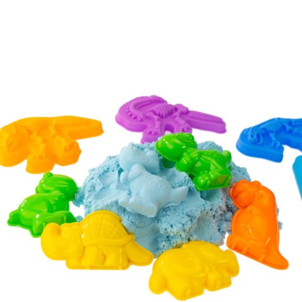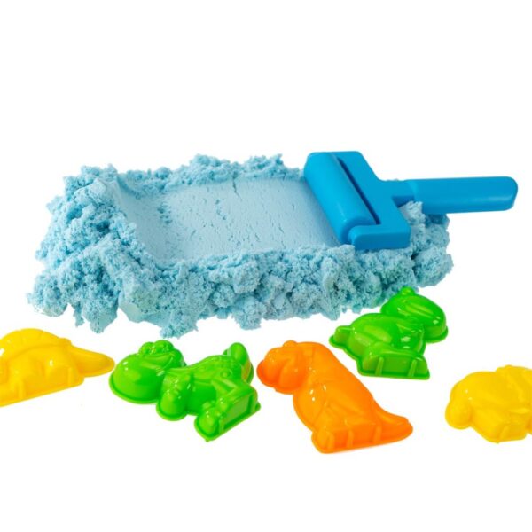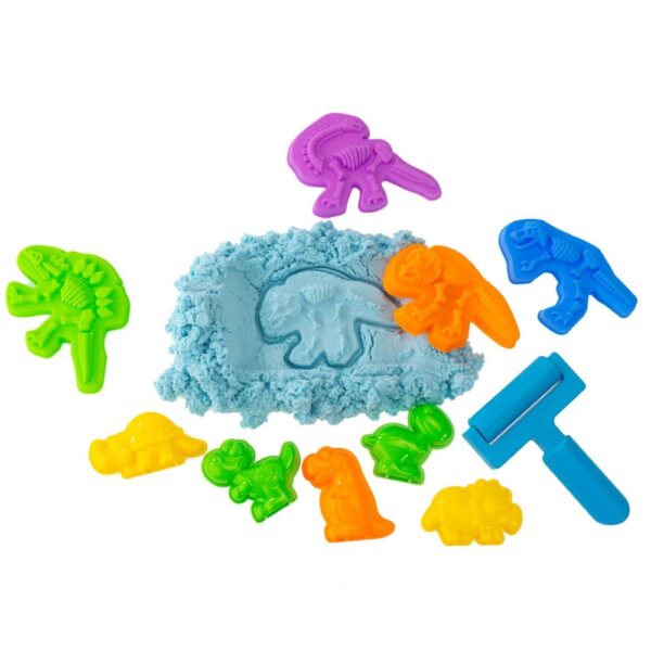CONTENUTO:Â 5 sacchetti di sabbia Spongy colorata in buste da 200gr, 4 stampini di fossili, 5 stampi di dinosauri, 1 rullo e un vassoio utilizzabile come area di lavoro.