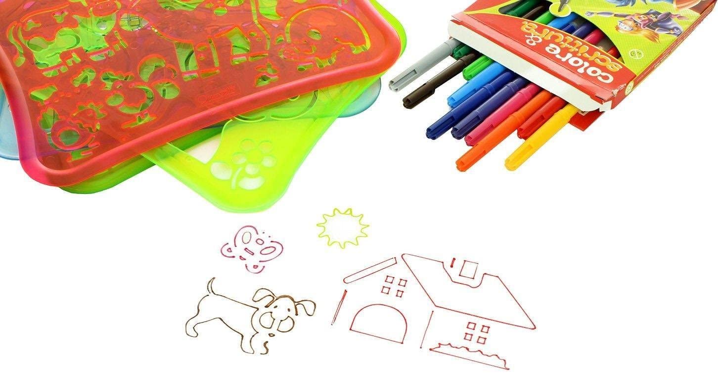 Una nuova serie di sagome realizzate senza spigoli ed in materiale infrangibile, con nuovi profili che permettono un disegno preciso e senza sbavature grazie al bordo rialzato intorno al perimetro esterno. Il cestino segue la forma delle sagome e le contiene comodamente insieme ai pennarelli: il coperchio trasparente, poi, oltre che ulteriore sagoma tutta da disegnare, ha anche la funzione di portapenne sia in orizzontale, da un lato, che in verticale, dall’altro, utilizzando i fori disposti a cerchio. Sviluppa le capacità creative, l’immaginazione, ed è un’utile introduzione al disegno.
