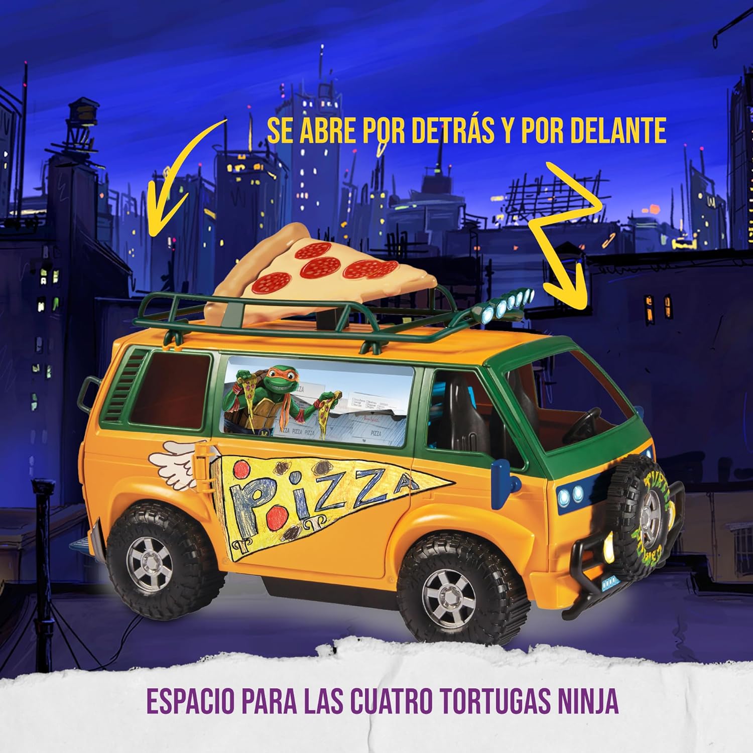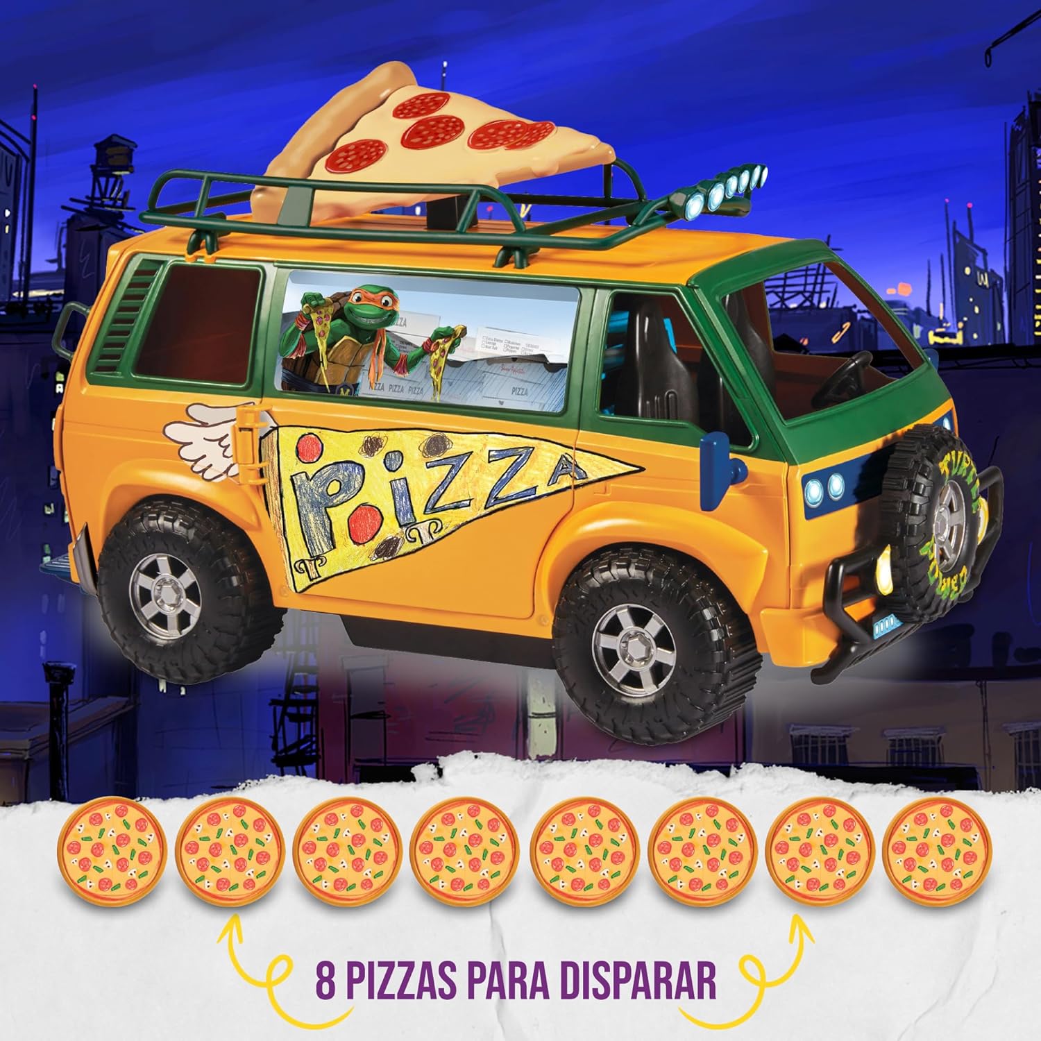 Il Van lancia pizze delle Tartarughe Ninja: un must have per l’intero team di mutanti! È compatibile con tutti i personaggi base. Basta premere la fetta di pizza sul van per aprire il portellone da cui uscirà lo spara pizze. Per azionarlo è necessario posizionare correttamente le pizze e premere la levetta. Con il mitico van le Tartarughe Ninja sono pronte a sconfiggere i nemici!