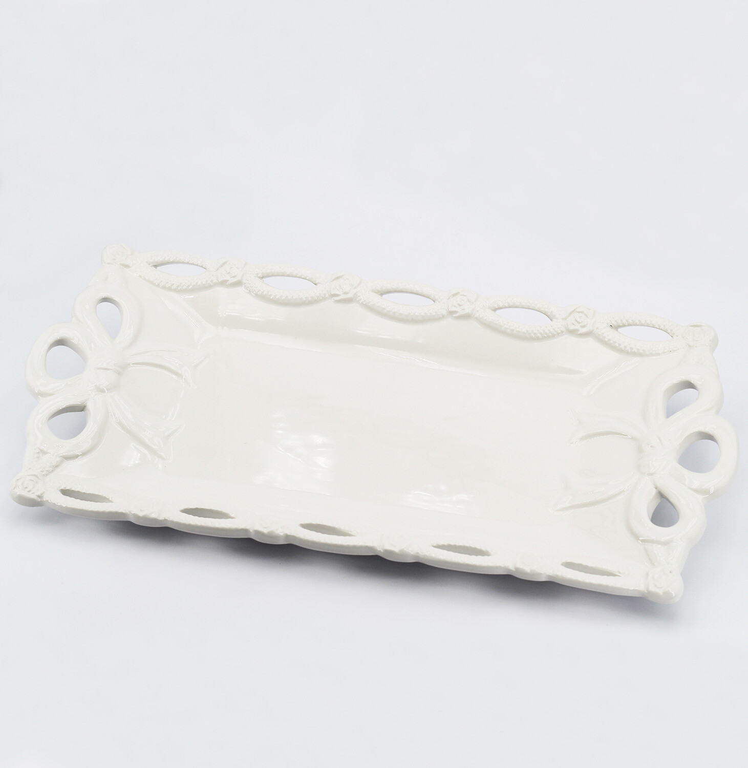 Descrizione articolo: Vassoio rettangolare con fiocco con astuccio rigido Materiale: Porcellana Colore: Bianco Dimensioni : Lunghezza 36 cm Larghezza 17 cm Altezza 2 cm Peso: 962 grammi La confezione comprende : Pz. 1 Include scatola: Si