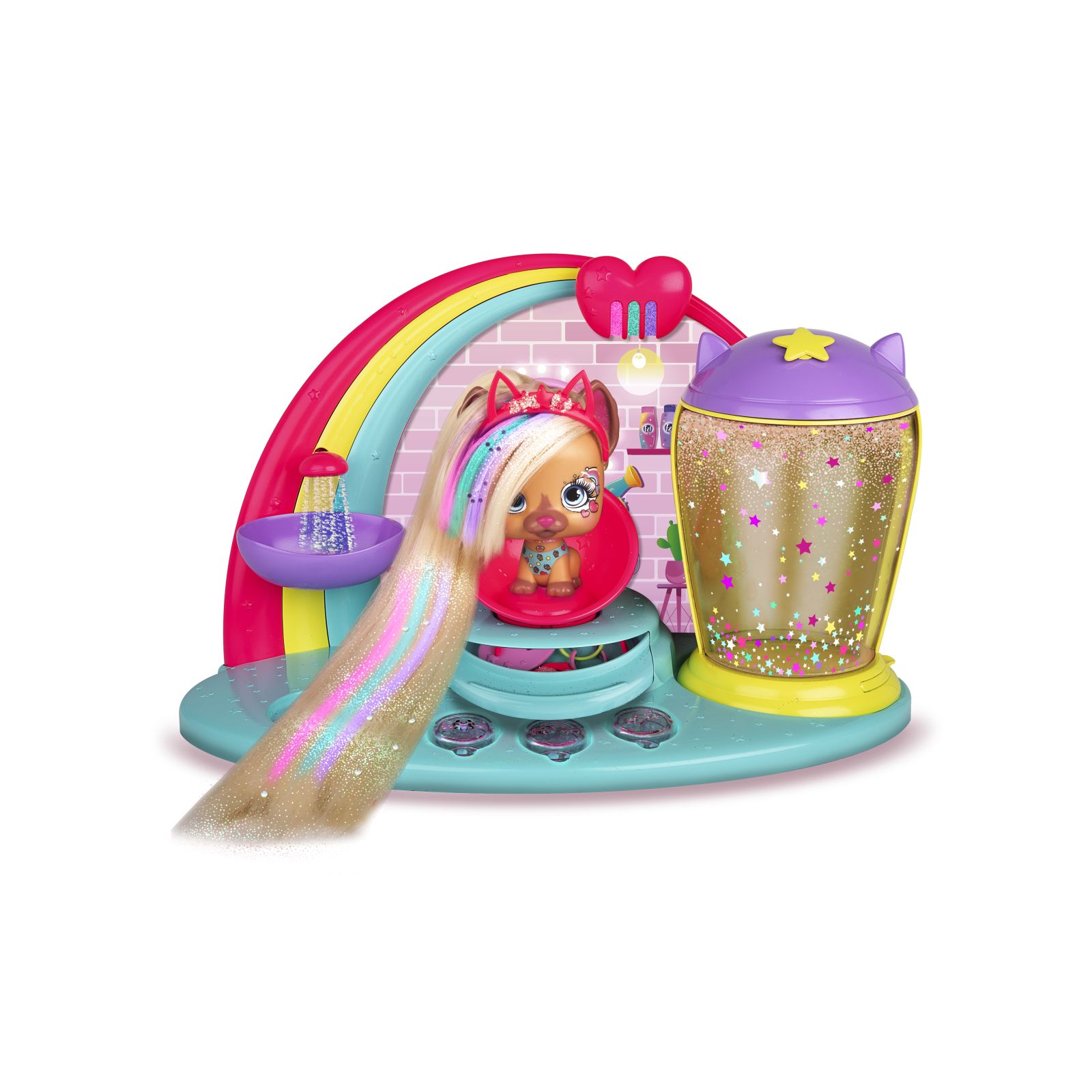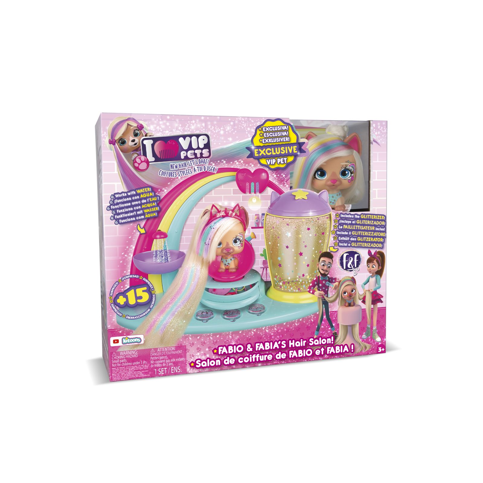 Il salone di Fabio e Fabia è il posto più amato dai VIP Pets ed ora è diventato un magnifico playset! Include una VIP Pet esclusiva: Kiara, la cagnolina di Fabio e Fabia. Oltre 13 accessori per pettinare e acconciare i capelli della tua VIP Pet, lavandino con acqua e speciale cabina-glitterizzatore