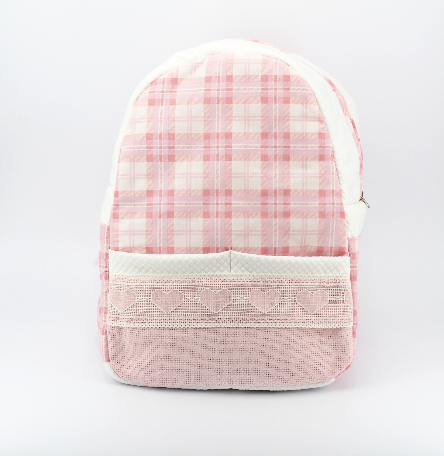 La confezione comprende 1 zainetto rosa fantasia scozzese, dimensioni: 27 x 12 x h 37 cm.
