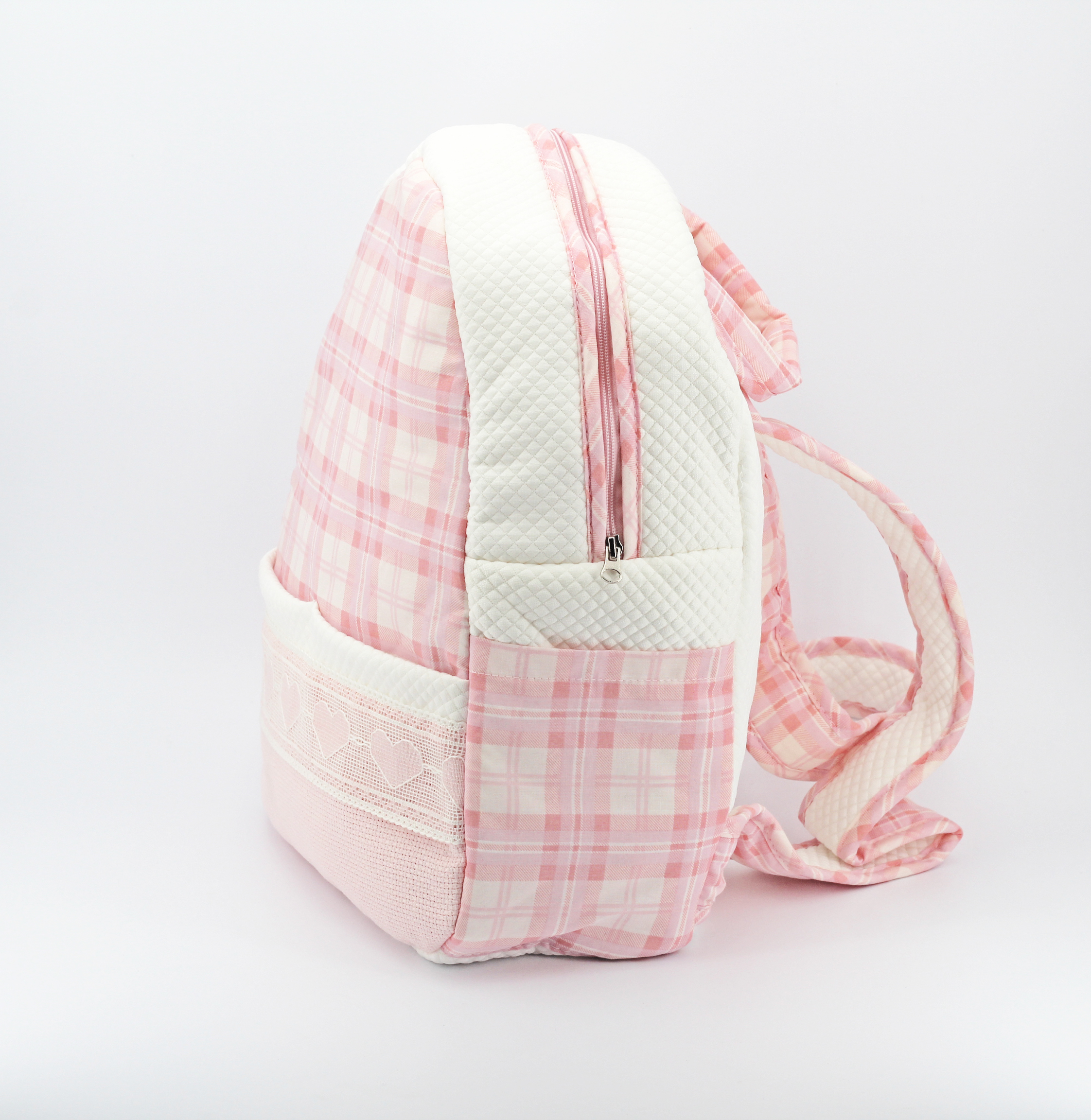 La confezione comprende 1 zainetto rosa fantasia scozzese, dimensioni: 27 x 12 x h 37 cm. puro cotone confezionato con busta trasparente